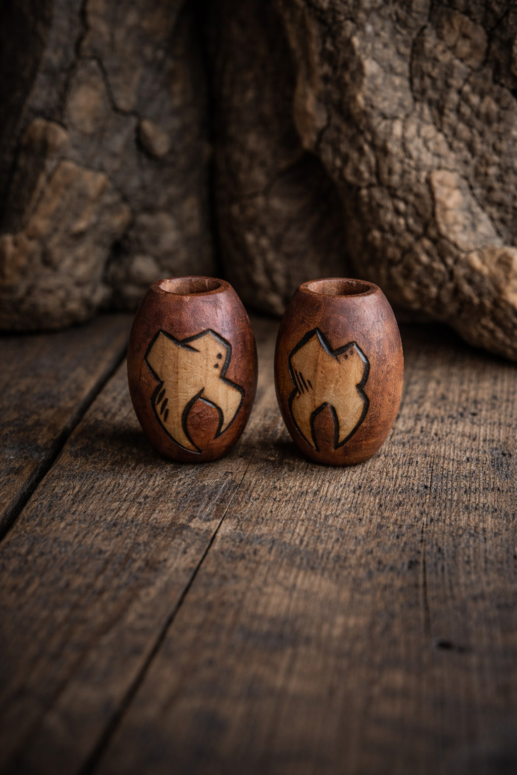 Diese beiden Dreadperlen sind nichts für Zahme – sie tragen das Zeichen der wilden Seite, die keine Kompromisse macht. Handgefertigte Holzperlen mit eingebranntem Zahn-Design, das so markant ist wie ein Raubtierlächeln unterm Vollmond.