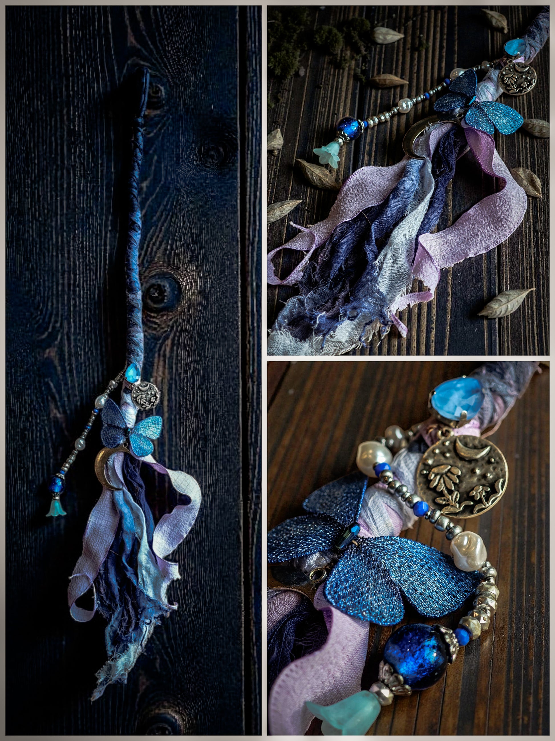 Dieser Dreadwrap ist ein kraftvolles Schmuckobjekt für alle, die Tiefe tragen wollen. Hekate vereint weich fließende, hochwertige Naturstoffe in Nachtblau, Rauchviolett und Schiefergrau mit schimmernden Schmetterlingselementen, echten Edelsteinperlen, Glasperlen und einem detailreichen Metall-Amulett als zentrales Highlight.