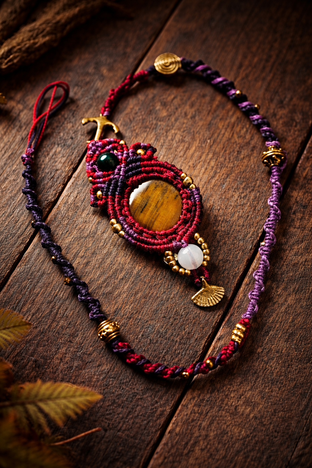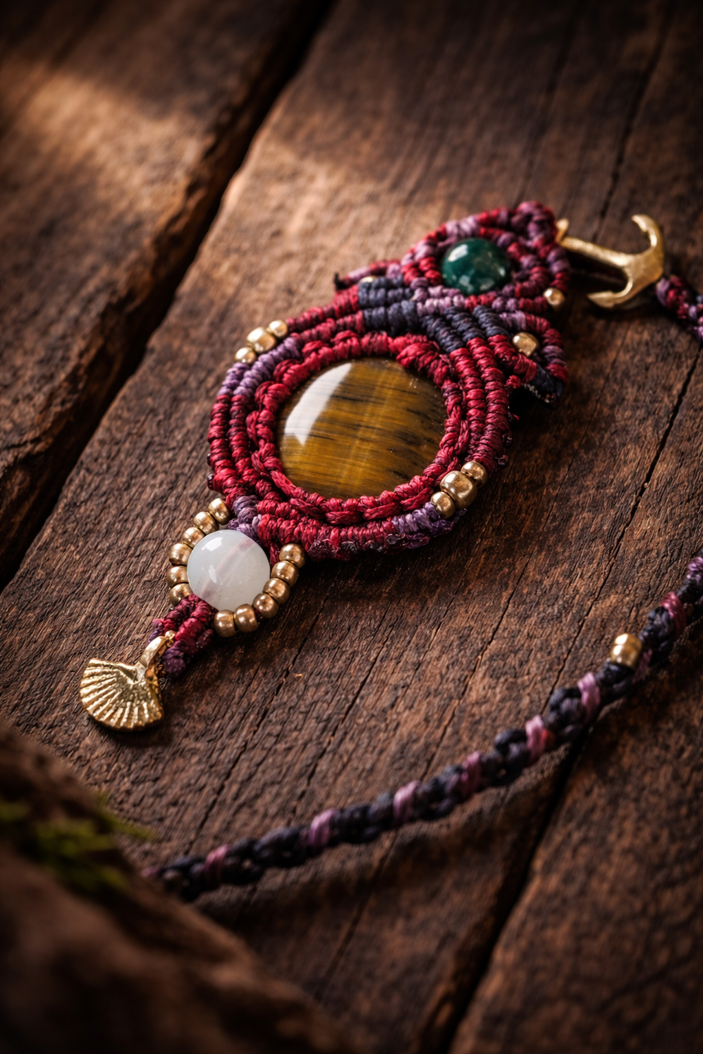 Das Mikromakramee in tiefem Bordeaux, Violett und dunklen Beerentönen umrahmt den Stein wie ein Schutzkreis. Messingdetails setzen erdige Akzente, während der Mondstein eine sanfte, ausgleichende Energie hinzufügt.