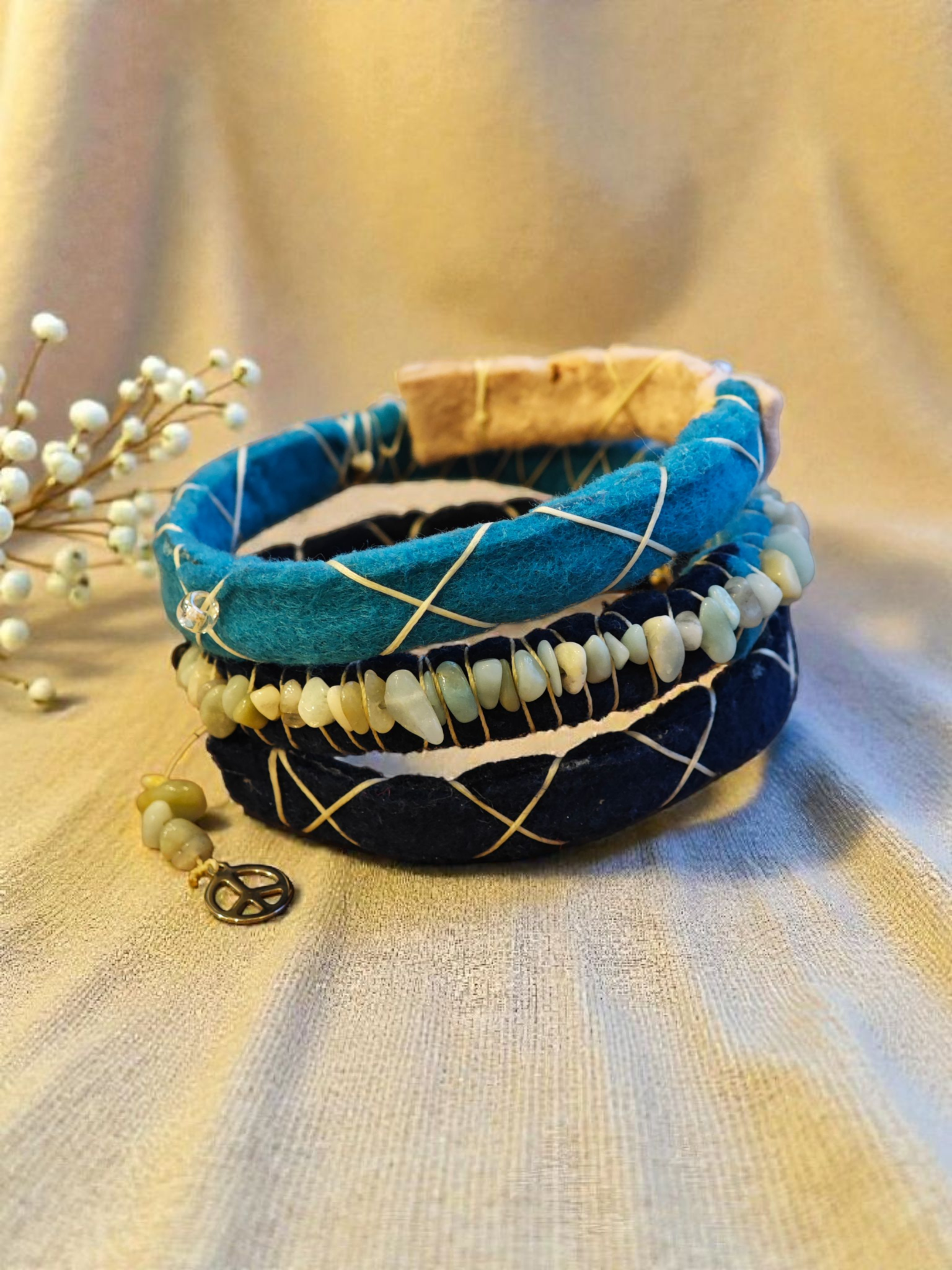 Die fein abgestimmten Heilsteine in hellen, milchigen Tönen bringen Ruhe ins Design und schaffen einen harmonischen Kontrast zu den dunklen Blau- und Petrolnuancen der Spirale. Sie stehen sinnbildlich für Klarheit, Ausgleich und ein Gefühl von innerer Weite – ruhig, stabil und zeitlos.